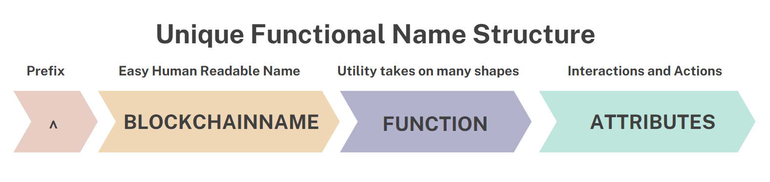 The Blockchain Name is structured with customizable functions (^MyName.function), which enable the management and organization of a wide range of digital assets and its associated data. Each function is equipped with specific attributes that can represent groups of data (ie; social.profile.friends ) or actions to take towards the data to perform execution of smart contracts (ie; social.profile.addpost ).